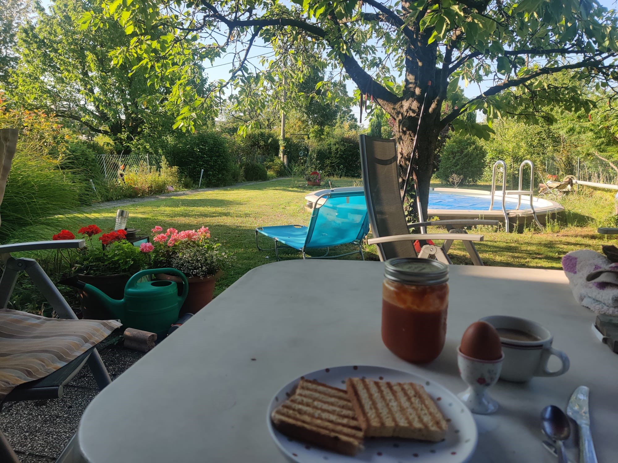 Heute war dann der erste wirklich warme Morgen seit ja fast Wochen und so ein schönes Licht, es ist dieses schon-August Licht. Das Wasser im Pool ist interessanterweise auch nach dem vielen Regen und kühlen Nächten ziemlich angenehm. Meine Arbeitsdeadline ist geschafft, die neuen Nachbarn grillen und machen fröhliche Geräusche. Bald ist das Kind wieder da. Und da sind, wie immer, diese Gedanken an jemand.