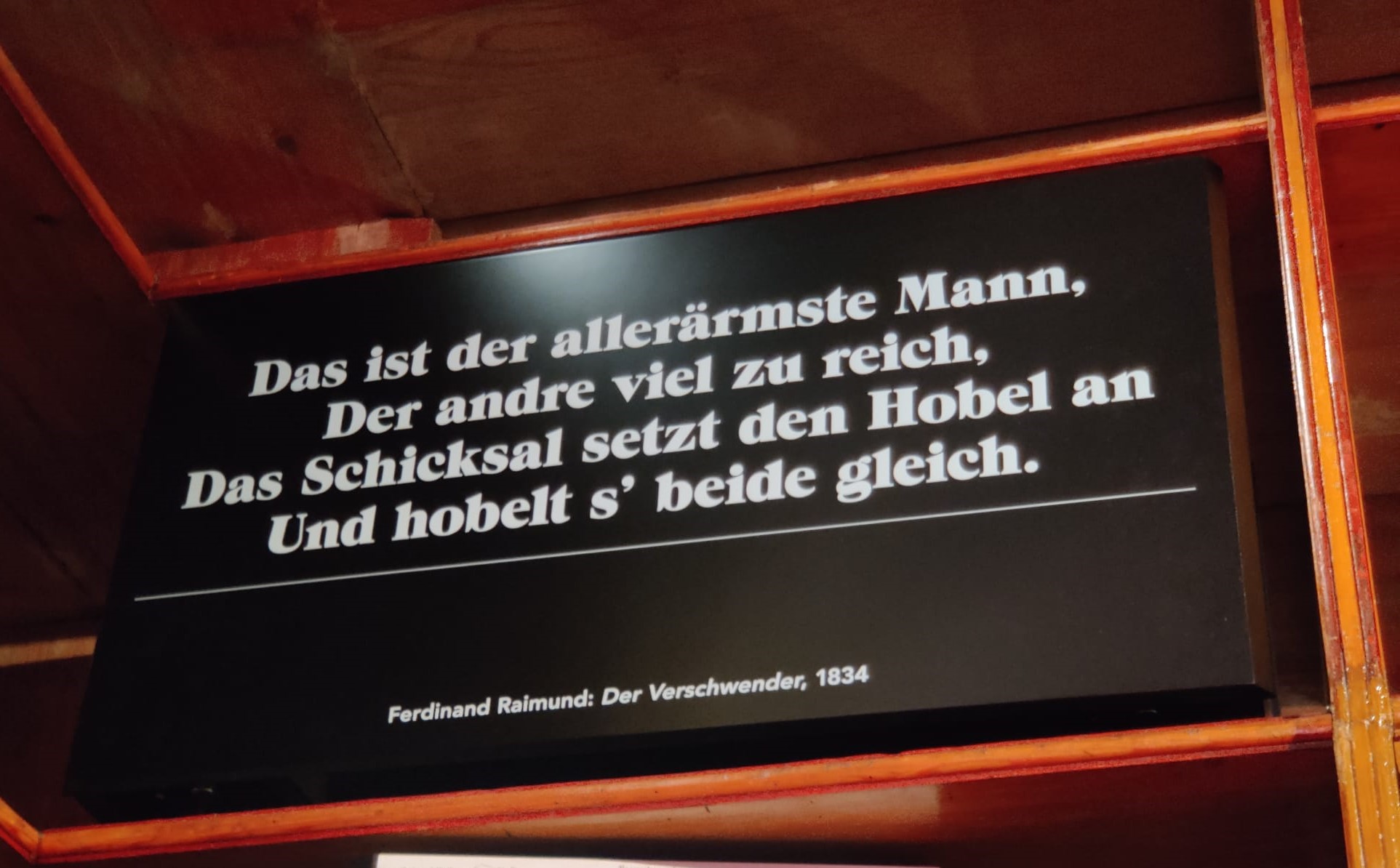 Sehr witzig ist, dass die Ausstellung gleich mit der Aussage von Friedrich Nicolai beginnt, einem Hauptvertreter der Aufklärung, dass die österreichische Literatur quasi nichts tauge. Gut, das war 1761. Dann gibt es eine ziemliche große Sektion über Franz Grillparzer (u.a. sein Arbeitszimmer). Hier habe ich mir angehört, was Konstanze Fliedl, bei der ich meine Diplomarbeit geschrieben habe, über Weh dem, der lügt zu erzählen hat – im ganzen Museum gibt es viele kleine Hörelemente. Weh dem, der lügt ist, wie man heute sagen würde, extrem gefloppt und Grillparzer hat danach keine Stücke mehr aufführen lassen. Das Scheitern wohnt den Schriftstellern auf die eine oder andere Weise ohnehin immer inne – auch Ferdinand Raimund, dem es ähnlich ging und der schließlich Suizid beging. Nestroy war eventuell etwas robuster.