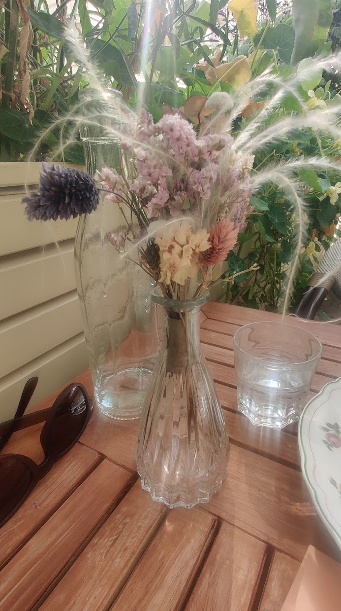 Man beachte die tollen getrockneten Blumen in der Vase. Und daneben auch viele noch lebende Blumen.