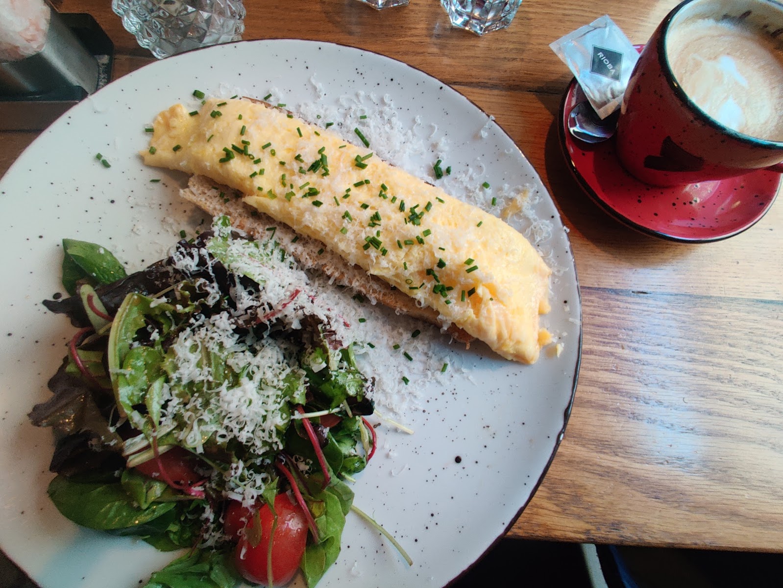 Dann im Lokal angekommen, haben wir uns für Omlette aus Bioeiern auf Sauerteigbrot mit Parmesan und Salat entschieden und es war sehr gut und fluffig, Omlette wie Brot.