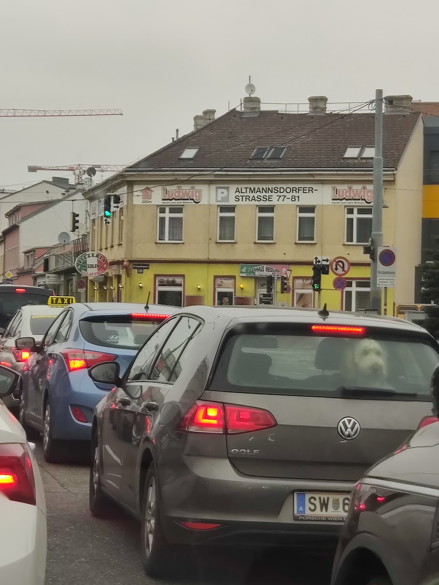 Ich komme jetzt dazu, random süße Hunde auf Rückbänken zu fotografieren, die das Kind beim Fahren nebenbei auch noch entdeckt.