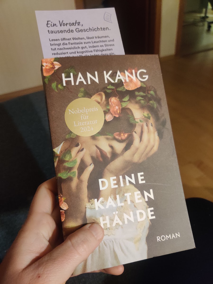 Am Freitagabend hab ich über die Stränge geschlagen und mir einfach so ein Buch fürs Wochenende gekauft, ich bin so oarg. Harhar. Und zwar das, was ich das Wochenende davor beim Morawa angelesen habe, Han Kang – die Nobelpreisträgerin von 2024 und das Buch Deine kalten Hände.