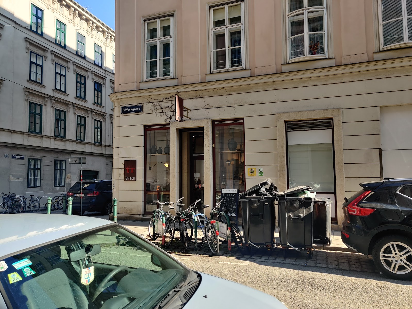 Heute war ich mit P. im Ährlich frühstücken. Das ist eine Bäckerei im 9. Bezirk, in der Wasagasse, gleich daneben ist ein Ende von Wien. So nenne ich das für mich, wenn ich eine ungewöhnliche Sackgasse sehe. Auch das würde ich gerne einmal analysieren, wie die Sonntage und die Straßenbahn-Endstationen.