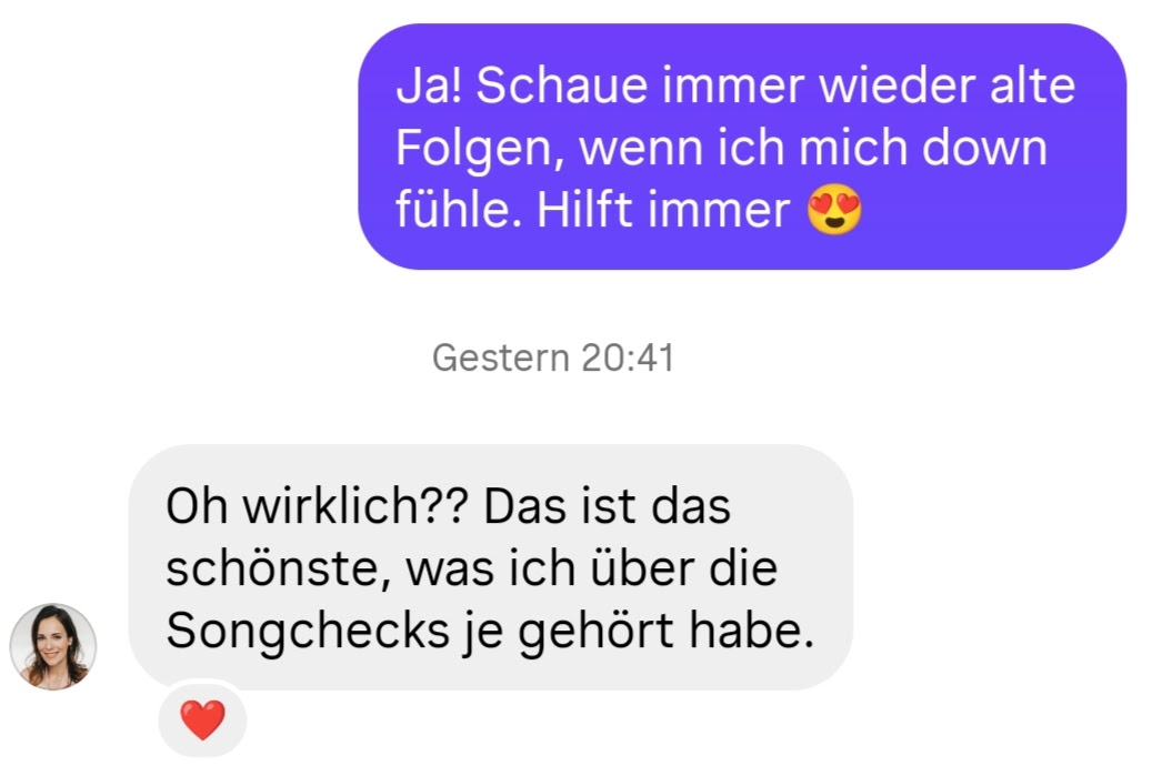 Und dann hatte ich nostalgische fünf Minuten und habe der Songcheck Moderatorin Alina Stiegler geschrieben und wir haben uns über die Sendung ausgetauscht: