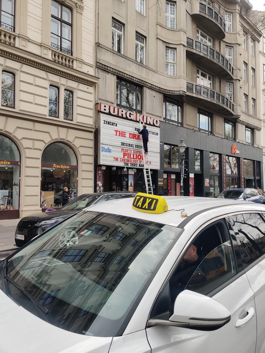 Heute habe ich mich beeilt, meine letzte Arbeit vor Ostern fertig zu machen und abzuschicken, und dann hatte ich ein bisschen Stress, ins Burgkino zu kommen, wo ein Mensch gerade erst “Robert Pattinson” in großen Lettern auf der Anschlagfläche befestigt hat. Der ist aber spät dran, dachte ich schmunzelnd, nur noch 30 Minuten, bis der Film um vier beginnt.